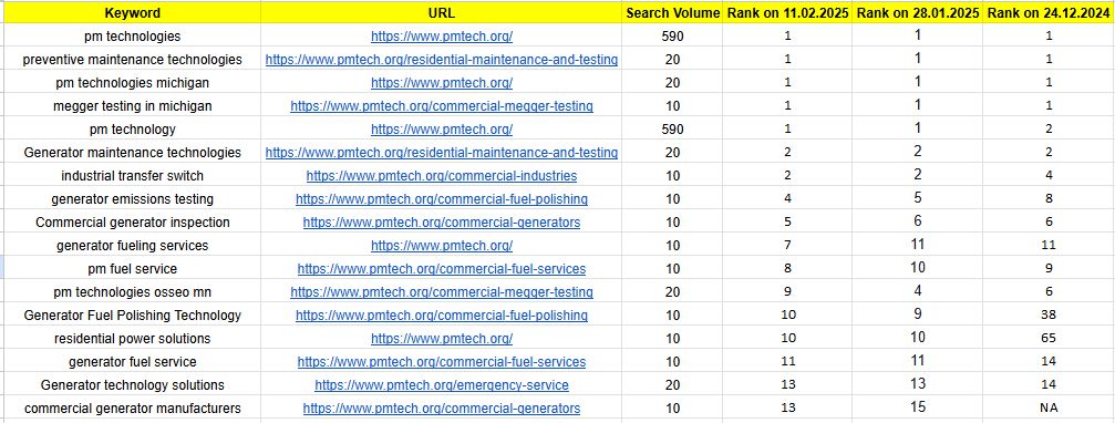 Result: Keywords like “Megger testing in Michigan, "Generator maintenance technologies "” reached top SERP positions.