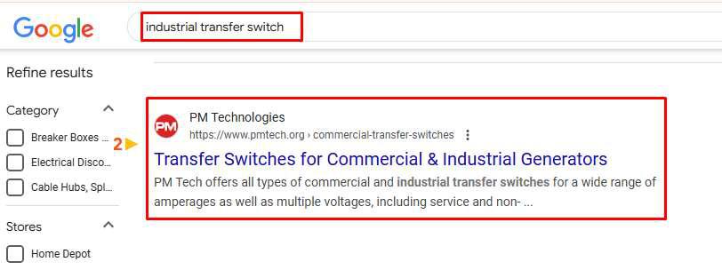 Result: "Industrial Transfer Switch” The keyword is successfully ranked in the 2ND position on Google SERP and is classified as a commercial keyword.